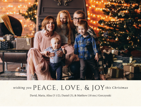 Our Grand-size Christmas cards are available as 6x8 flat cards printed in full color on 120lb cardstock.  White 6x9 envelopes are included when shipped or mailed. Chalk Line will mail your cards directly to your mailing list or ship them to you.