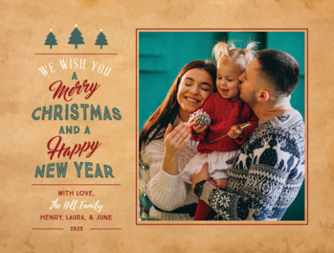 Our Grand-size Christmas cards are available as 6x8 flat cards printed in full color on 120lb cardstock. White 6x9 envelopes are included when shipped or mailed. Chalk Line will mail your cards directly to your mailing list or ship them to you.