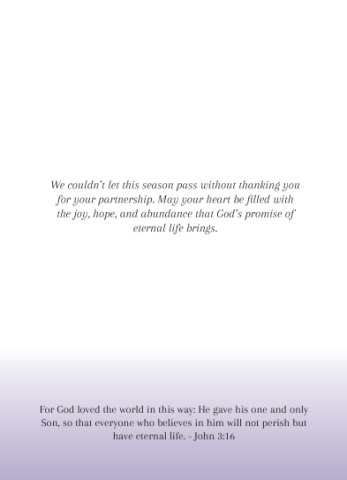 *Note: for Email-Add Ons, you may choose between a Static Email $9.99 (Exact copy of your card converted into an email), or a Static Email PLUS $12.99 (Exact copy of your card converted into an email, PLUS one hyperlink, links to social media, giving button added and introductory paragraph above card.) For each recipient in your email list, there is a $0.03 sending fee. For additional options, please visit our separate Email Newsletter item.